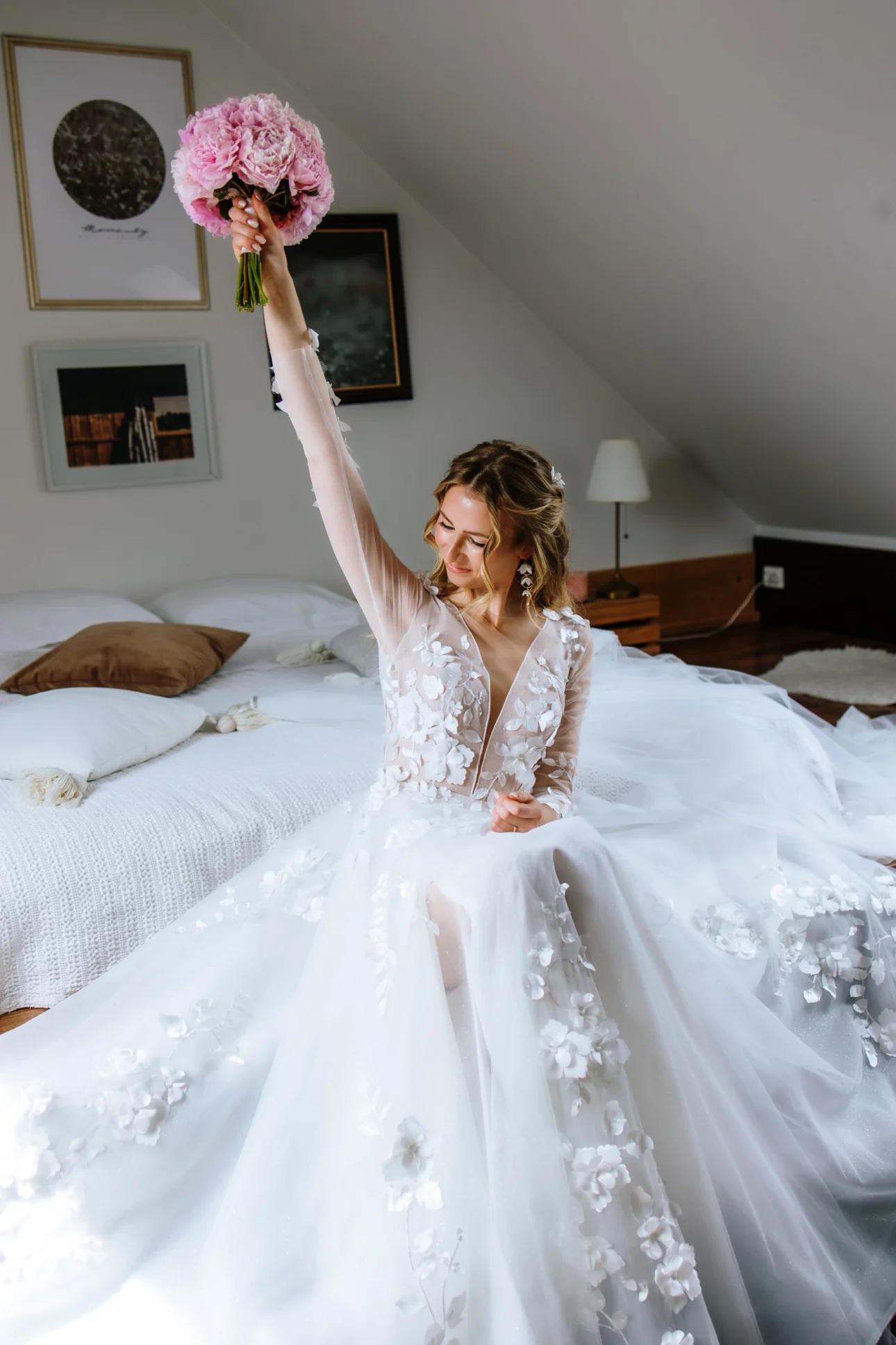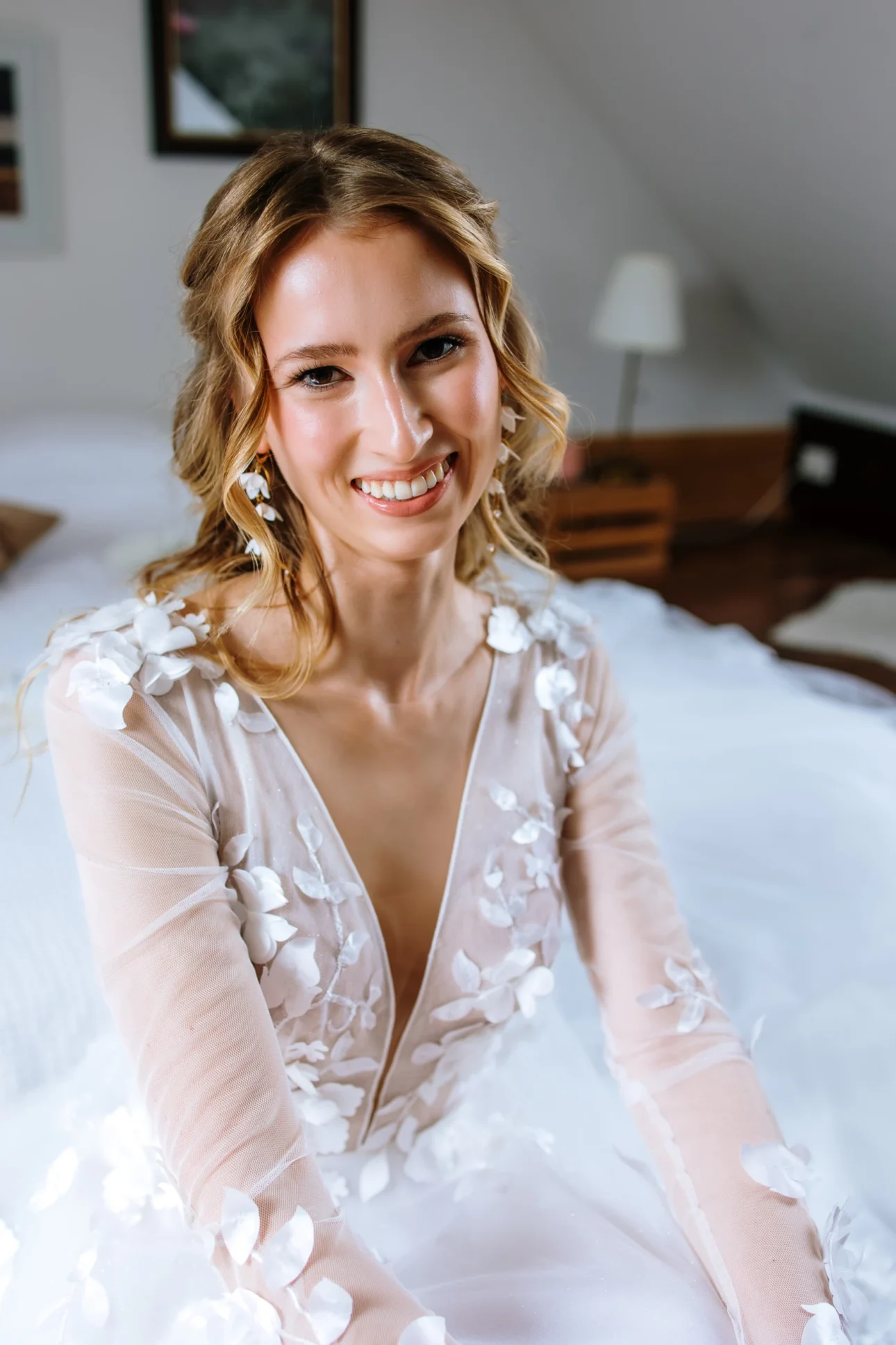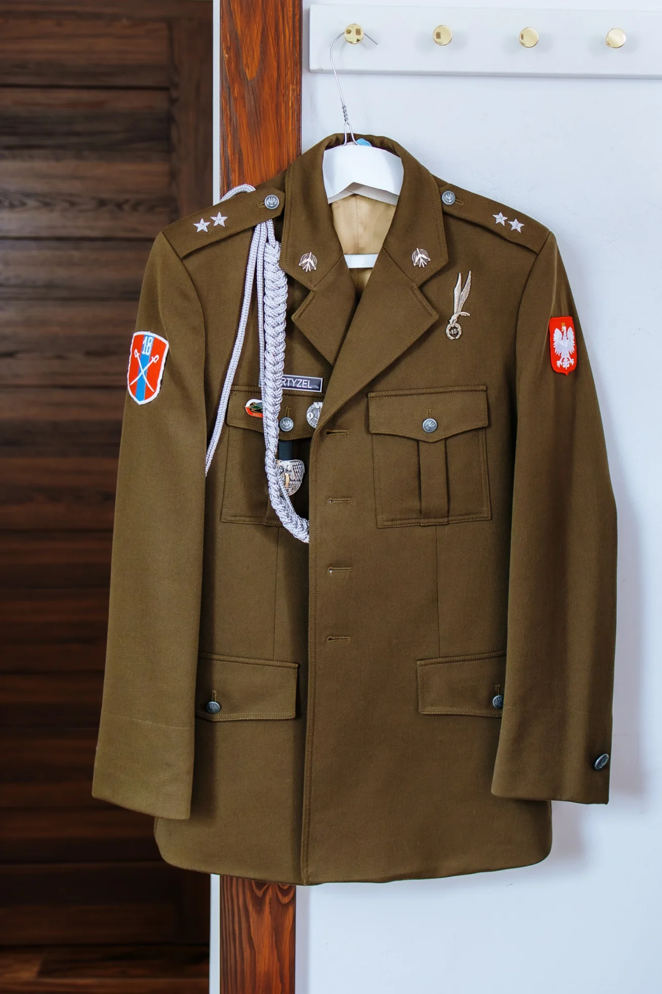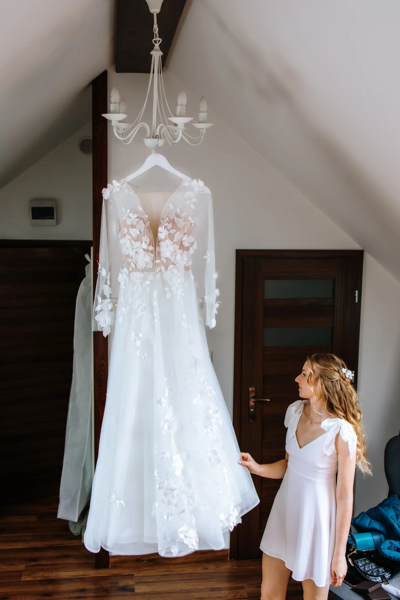 Przygotowania zaczęliśmy na miejscu, co zawsze polecamy każdemu. Brak logistycznego koszmaru, stania w korkach i stresu, czy fryzjerka zdąży, to połowa sukcesu spokojnego poranka. Na antresoli wrzało (w pozytywnym sensie) podczas robienia fryzur i makijażu. Światło wpadające przez okna dachowe Dworzyszcza to marzenie każdego operatora – miękkie, plastyczne, idealne do portretów. W tym samym czasie w pokojach na dole Andrzej przygotowywał swój mundur. W powietrzu unosiła się ta specyficzna mieszanka podekscytowania i męskiego spokoju. Zero paniki, dużo śmiechu i braterskiej pomocy przy poprawianiu pagonów.