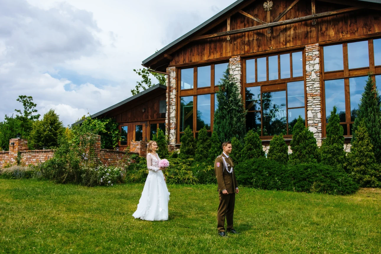 Punktualnie o 14:00 zorganizowaliśmy First Look przed salą. To był jeden z tych momentów, dla których warto robić to, co robimy. Emocje były tak gęste, że można by je kroić nożem. Andrzej w pełnym umundurowaniu, Kasia w sukni, która wyglądała, jakby była utkana z mgły. Emocje? Gigantyczne. W MovieTak uwielbiamy First Looki na osobności – to jedyna chwila w tym zwariowanym dniu, kiedy Para Młoda może być przez moment tylko ze sobą (i z nami, ukrytymi za drzewami).
