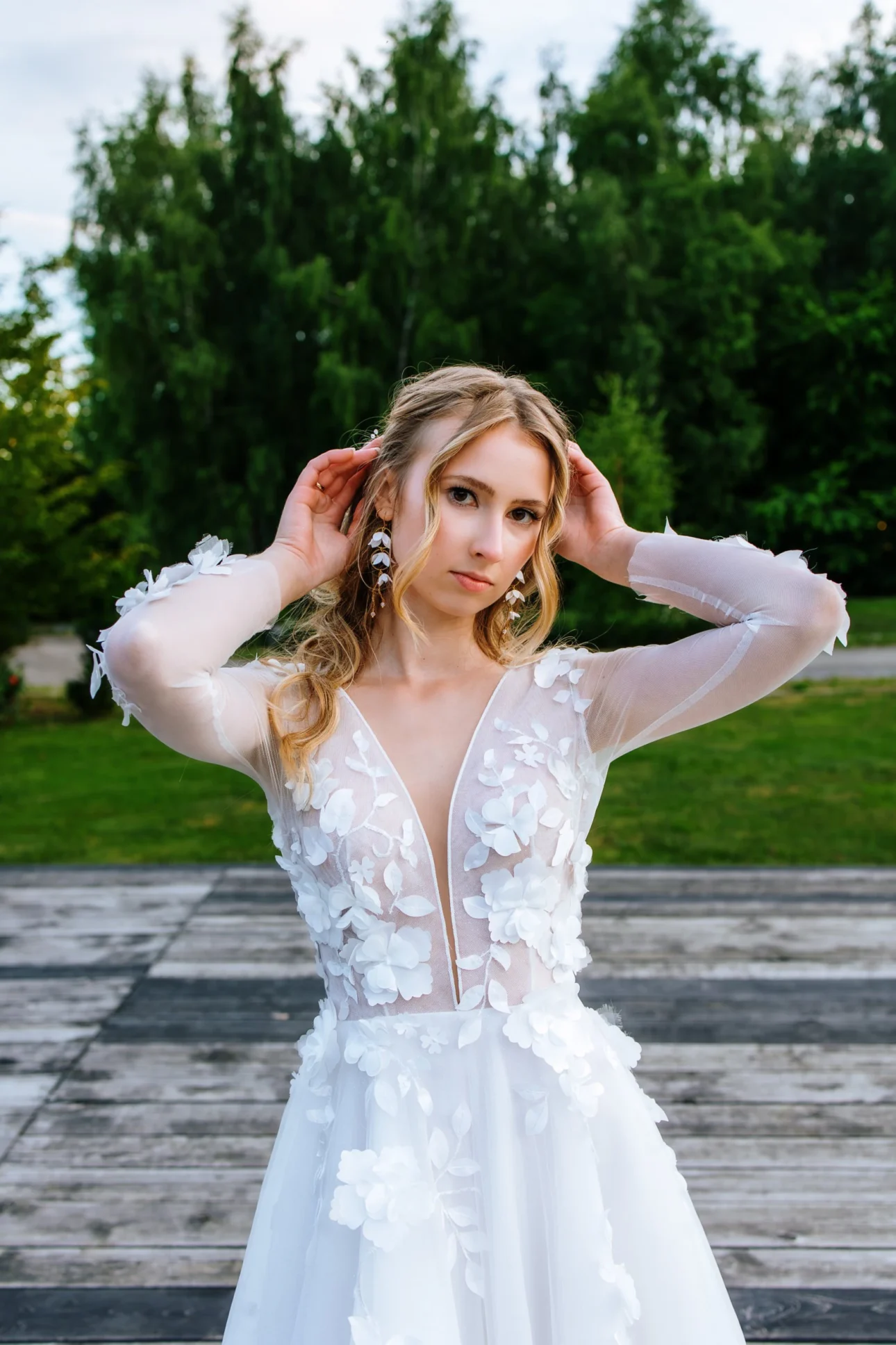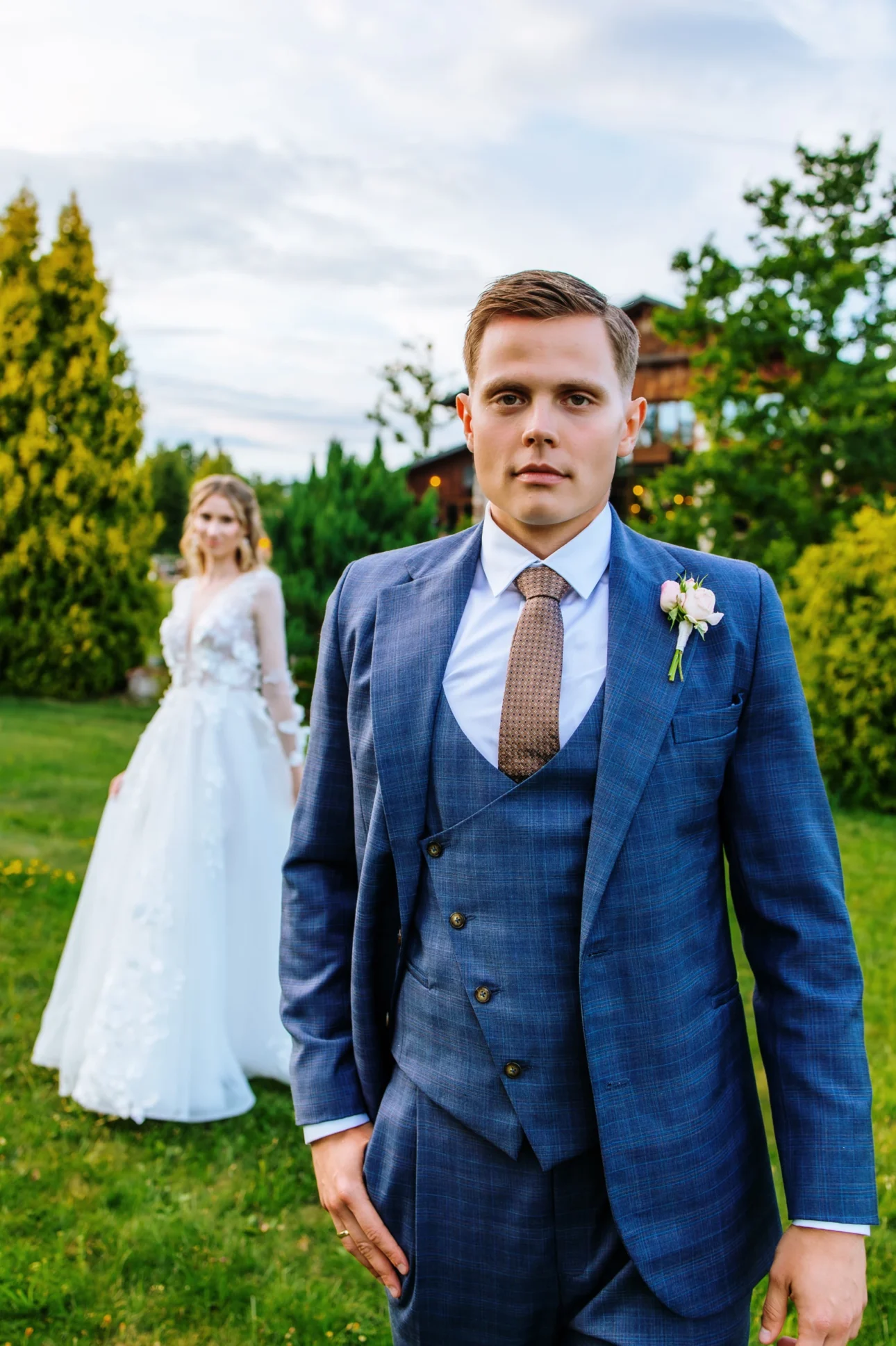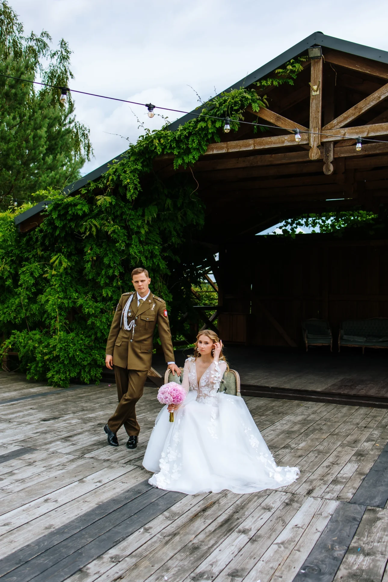 Andrzej przebrał się już z munduru w garnitur, co dodało sesji jeszcze większego luzu. Byli już po oficjalnych częściach, po stresie związanym z ceremonią. To był ich moment na złapanie oddechu. Spacerowali, szeptali do siebie, a my tylko wyłapywaliśmy to światło, które przebijało się przez liście drzew. Żadnego „stań tak”, „popatrz tam”. Tylko oni, ich bliskość i nasza dyskretna obecność. To wtedy powstają te najbardziej intymne portrety.