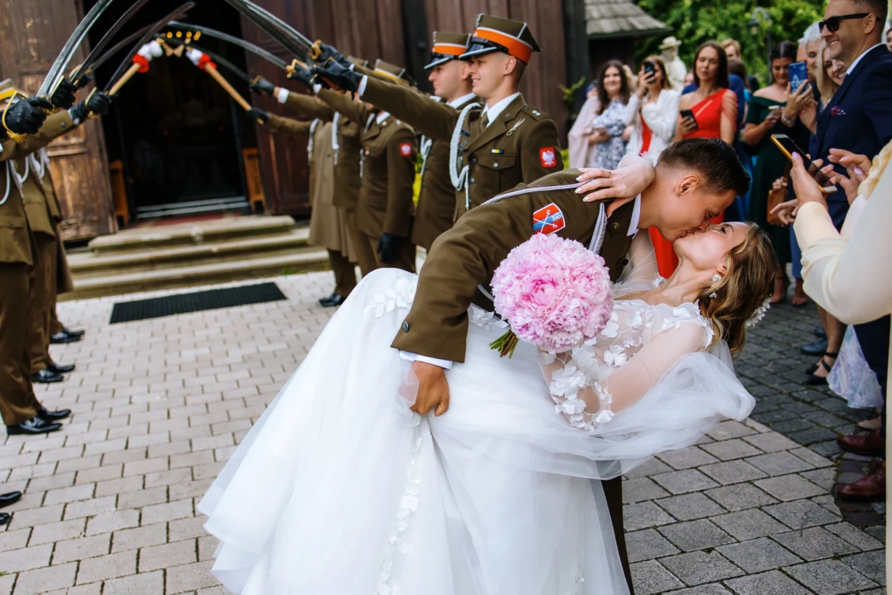 Wyjście z kościoła to klasyka – szpaler szabel. Jako fotografowie musimy być tu niesamowicie czujni. To trwa sekundy, a błąd jest niewybaczalny. Błysk stali, sypane kwiaty, uśmiechy gości i ten jeden, elegancki całus na końcu szpaleru. Złapaliśmy to z Agatą z dwóch różnych kątów i na różnych ogniskowych, dzięki czemu w reportażu macie pełny obraz tej dynamiki – od szerokiego planu po bliskie zbliżenia na ich dociśnięte usta i przymknięte oczy.