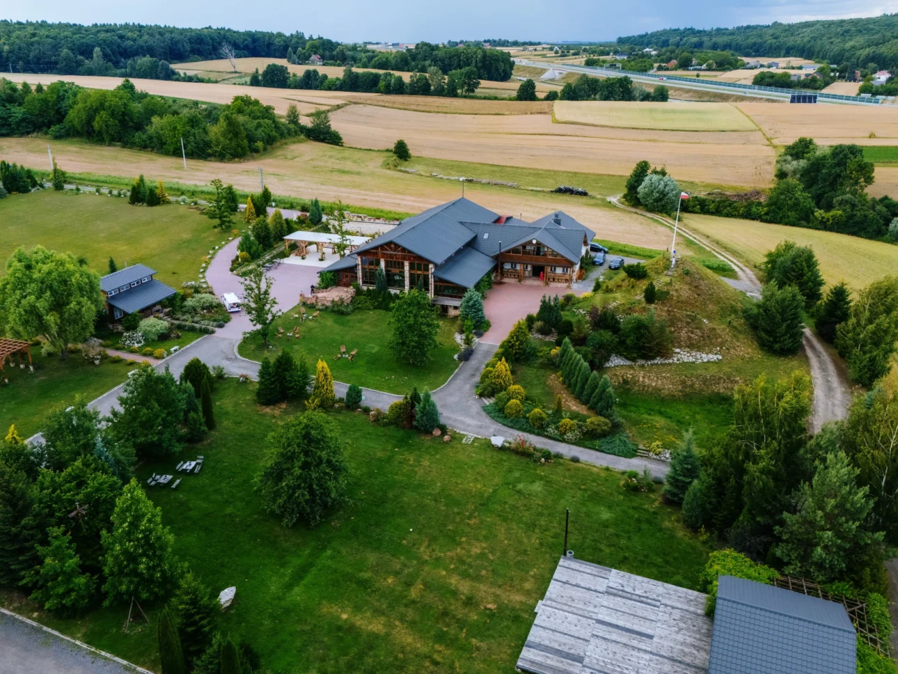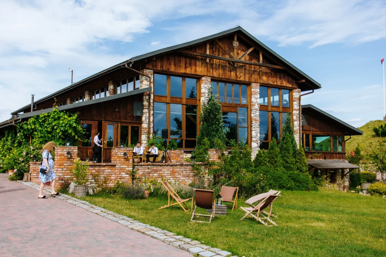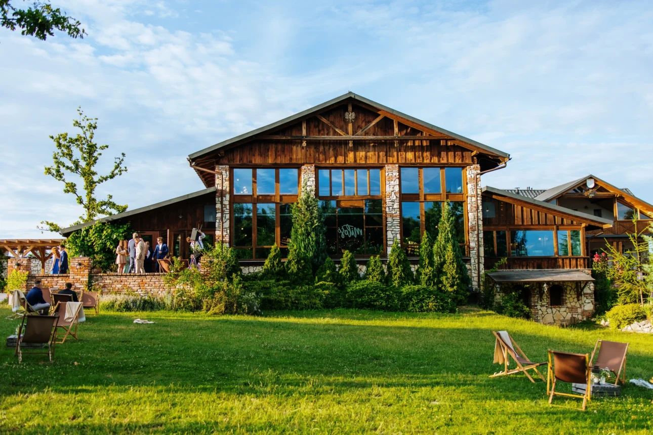 Tam nie ma nadęcia. Nie znajdziecie tu kryształowych żyrandoli i złoconych sztućców, które narzucają sztywną etykietę. Jest za to autentyczność: drewno, cegła i ogromne przeszklenia sali weselnej, która płynnie łączy się z malowniczym wzniesieniem otoczonym polami. Oprócz głównej sali z antresolą, Dworzyszcze oferuje klimatyczną salę kominkową oraz plenerową scenę z podestem tanecznym. A spacer w stronę różanej pergoli, gdzie często odbywają się ceremonie plenerowe, to czysta przyjemność dla oka (i obiektywu).