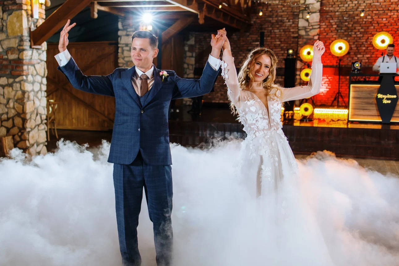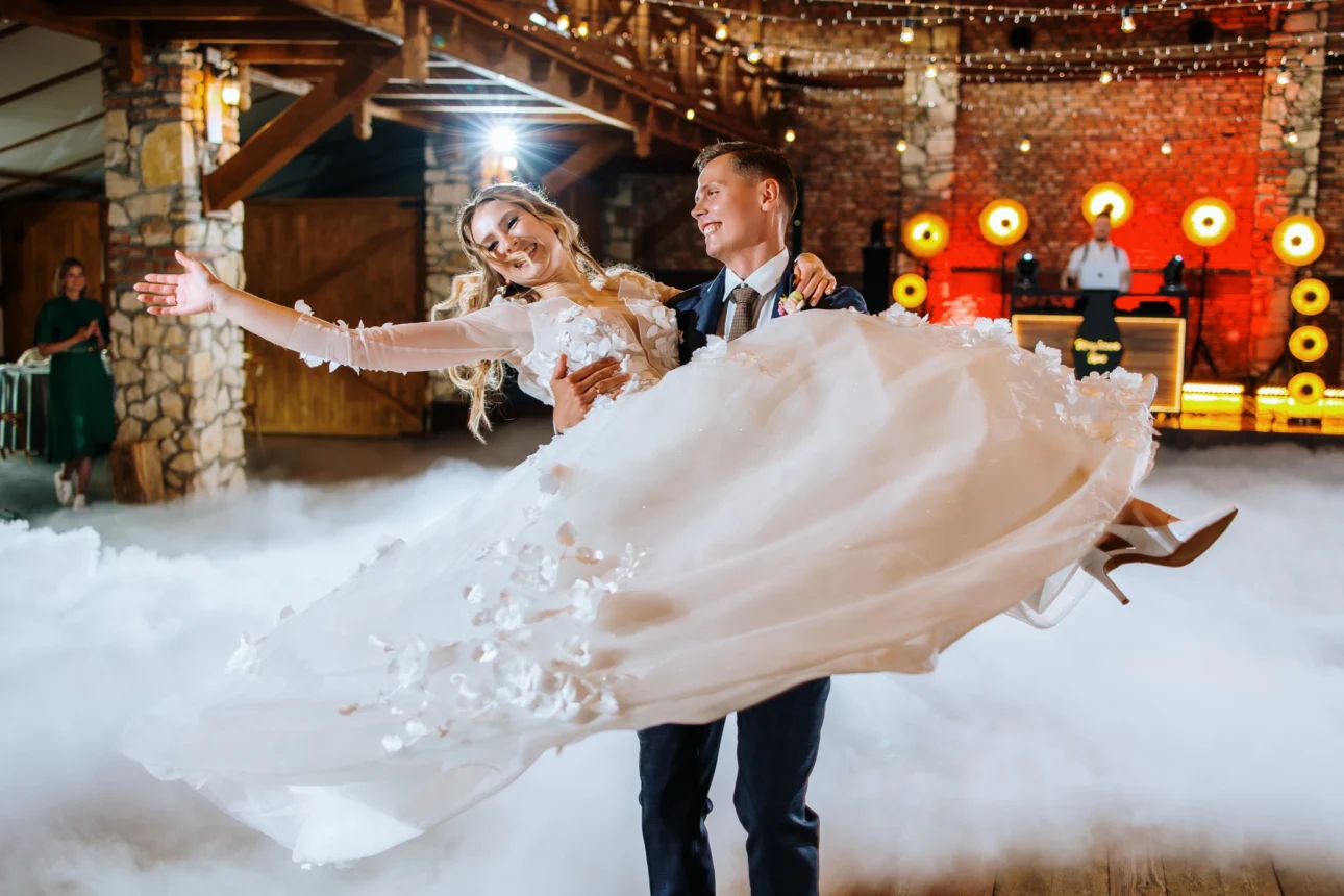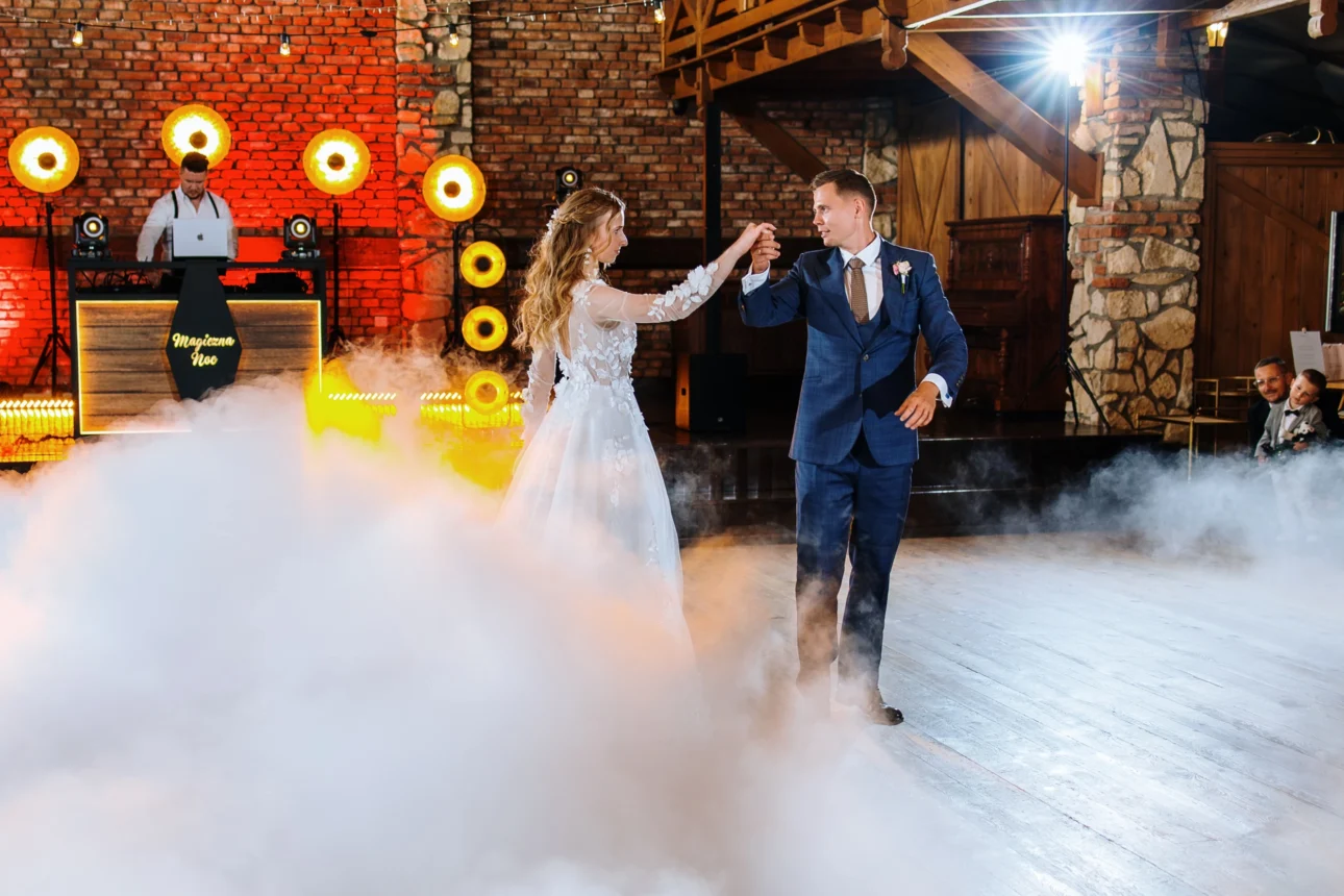 Pierwszy taniec? Piękna choreografia w ciężkim dymie. Kasia i Andrzej wyglądali, jakby płynęli nad parkietem stodoły. Za muzykę odpowiadał Tomasz Korus z Magicznej Nocy. Jeśli ktoś potrafi rozbujać 125 osób w pięć minut, to jest to właśnie on. On nie tylko puszcza muzykę, on nią zarządza, czując każdą zmianę nastroju na sali.
