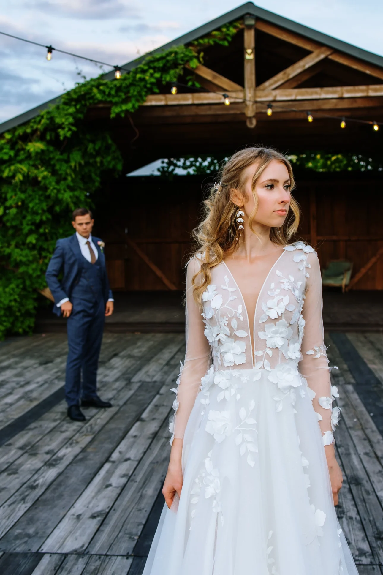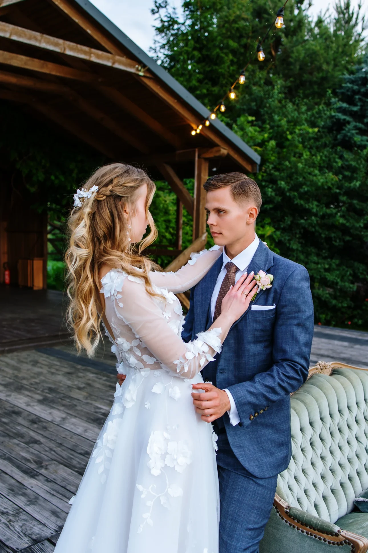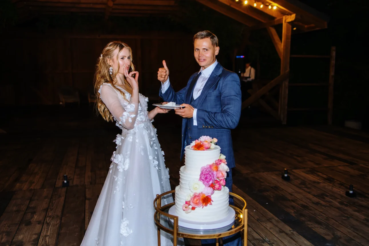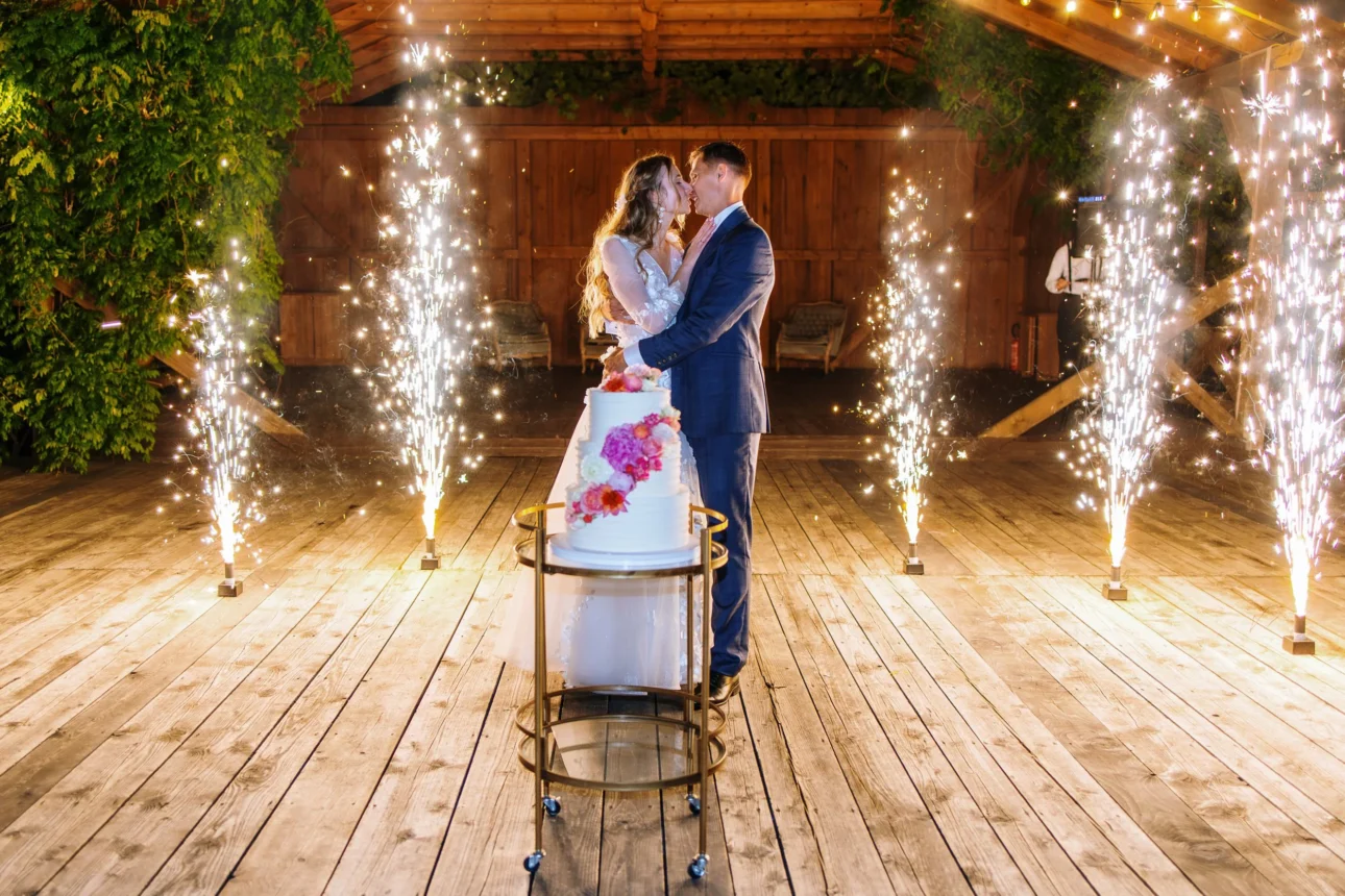 Wieczór w stodole przyniósł kolejne unikalne klatki. Tort o 22:00 nie wjechał przy zgaszonym świetle na środek sali. Wjechał na zewnątrz, pod gwiazdy, przy blasku rac trzymanych przez gości. To był spektakl światła, dymu i dźwięku. Na zdjęciach wygląda to fenomenalnie – dynamika, ogień i radość gości tworzą tło, którego nie da się podrobić.