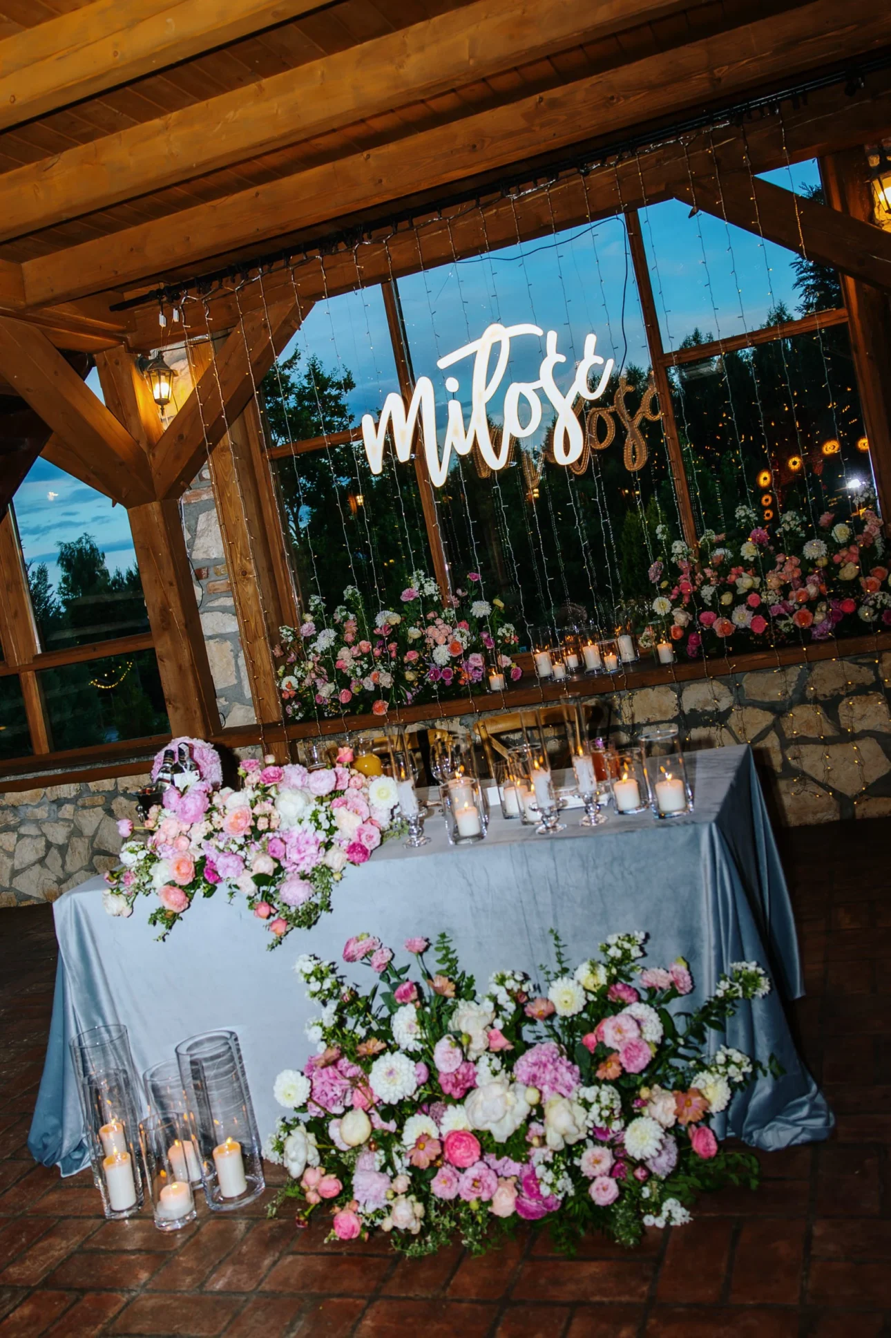 Wystrój, który przygotowała Agnieszka Błaszczyk z AB Kwiaty, był absolutnym majstersztykiem. Wyobraźcie sobie głęboki, niebieski welur na obrusach – coś, co rzadko spotyka się na sesjach ślubnych, a co wygląda niesamowicie szlachetnie i głęboko. Ten granat idealnie kontrastował z jasnym wnętrzem stodoły i surowym drewnem. Do tego kwiaty w odcieniach pudrowego i ciemnego różu z dużą ilością soczystej zieleni. To nie było „katalogowe” i nudne. To miało charakter, teksturę i pazur. Dokładnie tak, jak nasi bohaterowie.