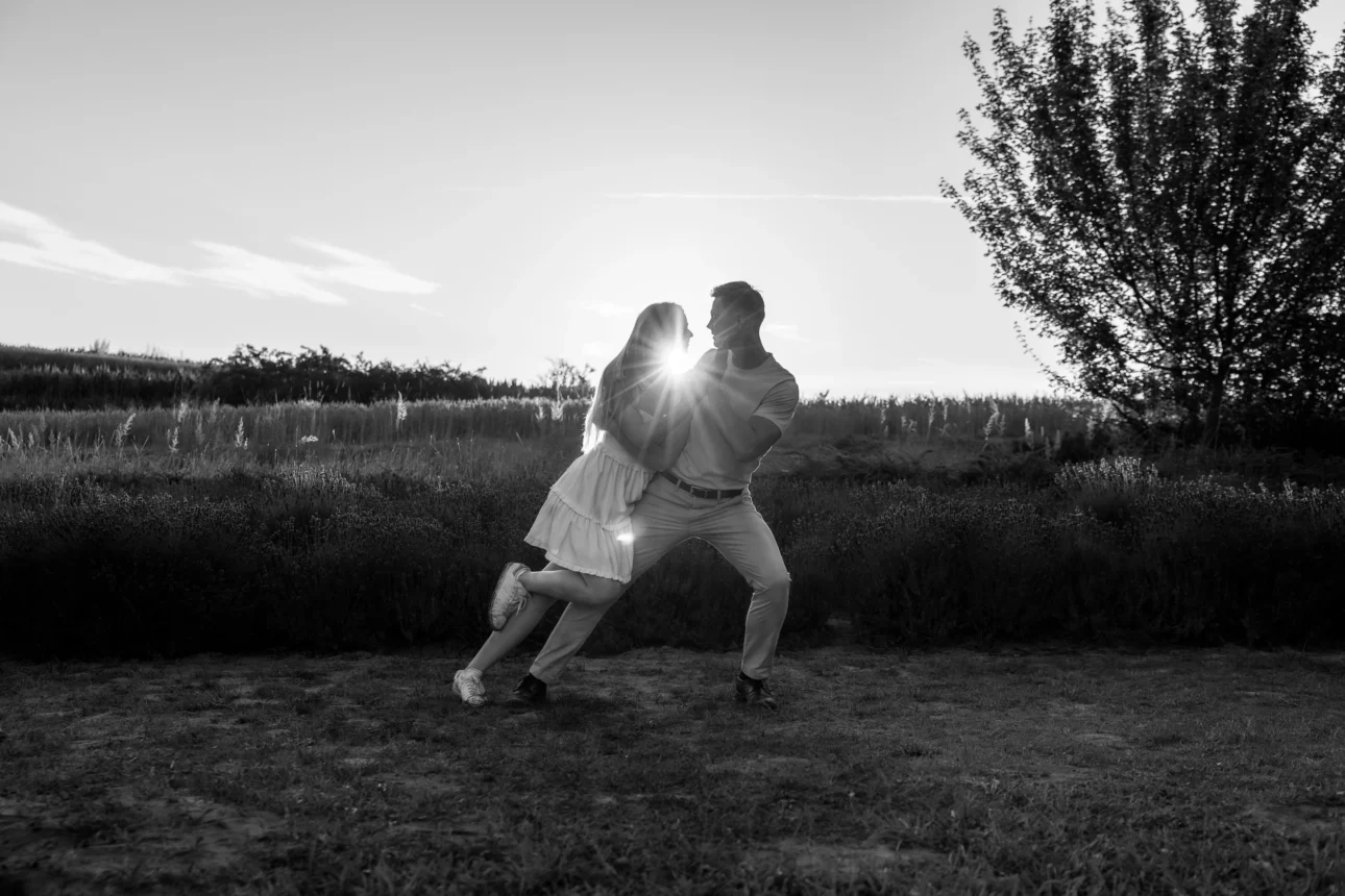 Wybraliśmy pole lawendy pod Krakowem. Przełom czerwca i lipca to jedyny moment, kiedy ten fiolet dosłownie obezwładnia. Byliśmy tam o świcie – rosa na trawie, miękkie słońce i zero postronnych osób. To właśnie tam Kasia i Andrzej pokazali nam swoją prawdziwą twarz: wiecznie uśmiechnięci, radosni i – co najważniejsze – szalenie w sobie zakochani.